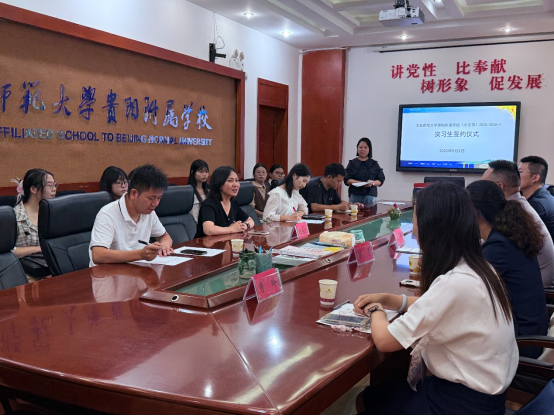 随后,北京师范大学贵阳附属学校(小学部)执行校长倪永艳向各位师生介绍了学校团队成员及学校办学历史,表明北京师范大学附属学校(小学部)的办学理念:“让每一颗星星都闪亮”,希望实习生发挥自己的优势和热情,共同培育好每一位孩子,在教学岗位上奉献自己的力量。
