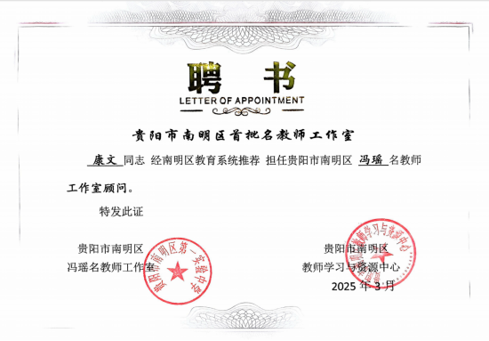 2025年5月28日,贵阳市南明区首批“三名”工作室之冯瑶名教师工作室顾问聘书颁发仪式在必威西汉姆联博雅楼举行。文传学院康文教授被聘为“贵阳市南明区冯瑶名教师工作室”顾问 。