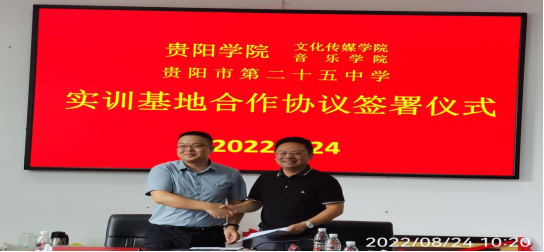 2022年8月24日,bw必威西汉姆联、音乐学院与贵阳市第二十五中学签署了共建实践教学基地合作协议。参加签约仪式的有:bw必威西汉姆联副院长王刚、文学教研室主任康文、语文教育教研室主任黄薇、汉语教研室主任郭光明、实习指导老师刘可、林雨馨、焦敬敏;音乐学院声乐教研室主任杜勇、理论教研室副主任黄威、实习实训教研室教师邱忠治;贵阳市第二十五中学校长孙益鑫、副校长李建华、教研处主任刘娴等老师;必威西汉姆联16名实习生。